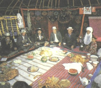 Распространённый головной убор - белая войлочная шляпа (калпак, неск. вариантов), зимой - шапки, отороченные мехом (тебетей). Обувь - мягкие сапоги с калошами. Ныне нац. особенности одежды сохраняются гл. обр. в сел. местности среди людей старшего поколения, а также среди пастухов на сезонных пастбищах (войлочные плащи, длиннополый халат и т. д.). Традиц. пища в осн. молочная (в тёплое время года) и мясная (поздней осенью и зимой). Молочные блюда - кумыс, айран, курут (вид кислого сыра, заготавливаемого на зиму и употребляемого в сухом виде или растёртым и разбавленным водой), топлёное масло, кипячёные сливки (каймак) и др. Из муки, кроме традиц. лепёшек, готовят боорсок - кусочки теста, жаренные в казане на бараньем сале, печённые в золе хлебцы и др. Характерно употребление конины. Излюбленный напиток - чай (на Ю. гл. обр. зелёный, на С. чёрный, в нек-рых местах - с молоком). Популярные виды спорт, развлечений - скачки на лошадях (ат чабыш), скачки (кёк бёрю), цель к-рых - поднять, не слезая с лошади, козла и доставить его к условленному месту, уходя от противников, старающихся отнять козла. Распространена борьба на лошадях (эниш).