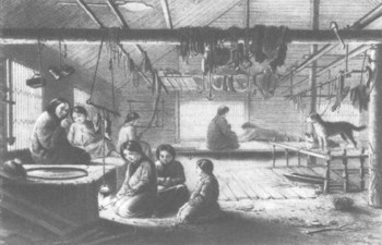 С наступлением теплых дней семьи из зимников разъезжались по летним селениям, летним жилищам, к-рые возводили на таежных речках, озерках, проточках; сооружали либо даура - четырехугольные корьевые домики с очагами на полу под дымовым отверстием в двускатных крышах, либо аундя - двускатные шалаши, конич. в виде чума, полуцилиндрич. (хомора) и др., крытые сеном, корой, берестяными полотнищами и т. п. Вне зимника жили - в одном или неск. местах от двух недель до двух месяцев. Здесь делали простейшие вешала - для сетей, для юколы (при обильном лове сигов или др. рыбы).