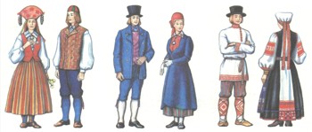 Традиц. жен. одежда сер. 19 в. - рубаха туникообразного покроя (сярк, хаме), полосатая юбка (сеэлик, кёрт), тканый пояс, верх, короткая кофта в талию (кампсун) или безрукавка (лийстик). На С. распространена короткая блуза с пышными рукавами (кяйсед). Костюм замужней женщины обязательно включал особый голов, убор (полотенчатый - линик, позднее чепец - тану, на С. и 3. - горшковидный, типа кокошника-поттмютс, кабимютс), передник, льняное (ылалиник, каал) или шерстяное покрывало (сыба). Голов, убор девушек - венок на твёрдой основе (пярг) или лента. Праздничная одежда украшалась серебряными пряжками - конич. (сыльг) и плоскими (пре-эс), цепочками с монетами и бусами. Значительно отличался жен. костюм сету, включавший элементы рус. одежды: рубаху-долгорукавку (позднее - т. н. новгородского типа с широкими рукавами) и косоклинный сарафан (рю-юд, сукман). Голов, убор - полотенчатый линик, девушки носили венок русского типа (ваник). Мужчины носили туникообразную рубаху с прямым разрезом ворота (сярк), штаны - длинные или до колен (пюксид), жилет (вест), куртку (ваммус), войлочную шляпу (каап). У сету была распространена рус. косоворотка. Верх. муж. и жен. одежда - кафтан, зимой шуба. Обувь - кож. постолы (пастлад), по праздникам - туфли у женщин, высокие сапоги у мужчин. Были распространены вязаныецветные варежки (киндад), чулки (су-кад), носки (сокид, капетад), на островах - свитера (трои).