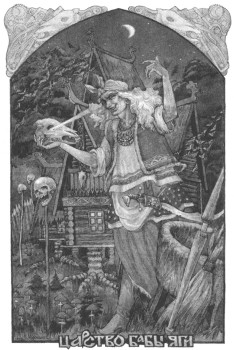Глядит девушка: кольями поляна утыкана, а посреди поляны стоит избушка
