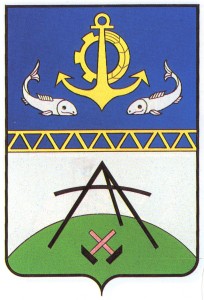Щит пересечен золотым поясом, мурованным остриями. В верхнем лазуревом поле круг из золотых шестерни и кокоса обременен якорем золотым же, сопровождаемым по сторонам двумя серебряными рыбами, плывущими навстречу друг другу. В нижнем серебряном поле с зеленым подножием черное клепало, подвешенное на tfenu к треножнику черному же, сопровождаемое внизу двумя перекрещенными молотками, натурального цвета.