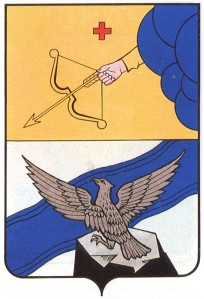 Щит пересеченный. В верхнем золотом поле выходящая из лазуревого облака слева рука натурального цвета в золотом одеянии, держащая золотой же лук со стрелой и сопровождаемая вверху червленым крестом. В нижнем серебряном поле лазуревая левая волнистая перевязь. Поверх всего сидящий на скале орел натурального цвета.