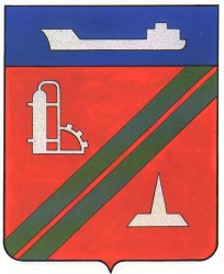 В червленом щите две левые зеленые перевязи, сопровождаемые вверху стилизованным серебряным нефтеперегонным агрегатом с примыкающим сегментом серебряной же шестерни, а внизу стилизованным остроконечным серебряным обелиском. В лазуревой главе щита стилизованный серебряный танкер.