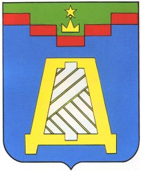 В лазуревом щитe стилизованная серебряная бобина с золотыми нитями, окаймленная золотом в виде литеры Д. В зеленой главе, пересеченной нисходящими червлеными брусками, золотая стилизованная кремлевская башня.