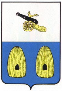 Щит пересеченный. В верхнем серебряном поле черная пушка с сидящей на ней золотой райской птицгй, колеса и лафет пушки золотые. В нижнем лазуревом поле два золотых улья.